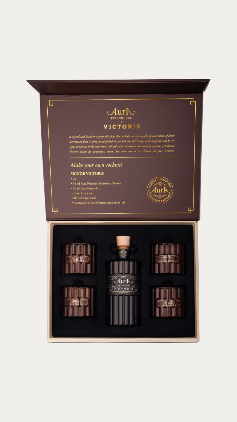 AURA PELINKOVAC VICTORIS POKLON BOX je vrhunski hrvatski poklon set kreiran za vrhunsko iskustvo kušanja. Uključuje Pelinkovac Victoris 0.5L i dvije brendirane čaše - sve što je potrebno za profinjeni ritual posluživanja i ispijanja.